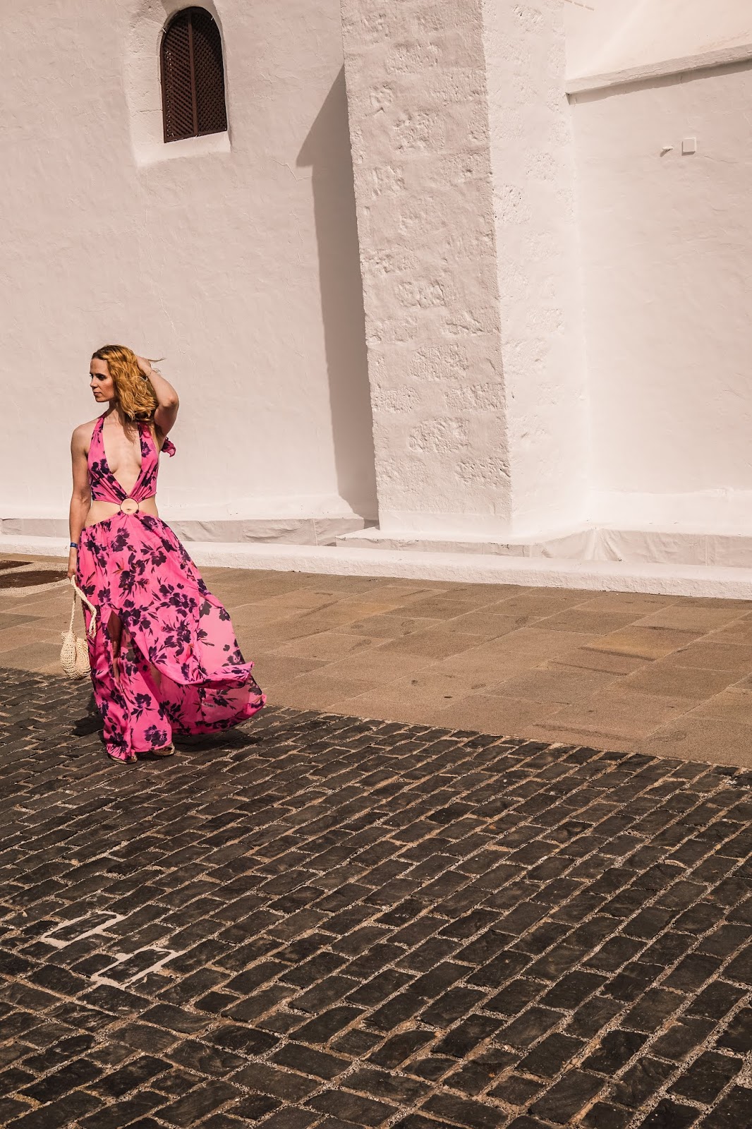 Este precioso vestido playero de color fucsia con estampado floral es de ASOS Design y ahora está de rebajas a mitad de precio! Tiene un escote muy pronunciado, la cintura al aire y lleva una anilla en el centro de la barriga. Tiene dos cortes en la falda larga y el material es ligero y vaporoso.